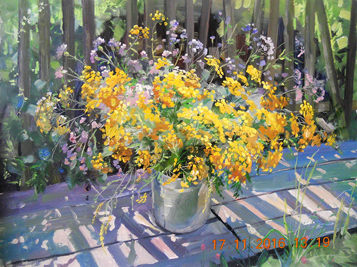 В этом названии — вся суть творчества художницы: безграничная любовь к родному селу Северное, в котором Римма Евгеньевна родилась и выросла, живёт и работает сегодня. В каждой её картине чувствуется трепетное отношение к любимому краю, богатейшей природе — и неважно, необъятные ли это лесные просторы или покачивающийся на ветру одинокий цветок, просё-лочная дорога или крутой берег реки Тартас, старый деревенский дворик или догорающий осенний день. На своей земле ей всё бесконечно близко и дорого…